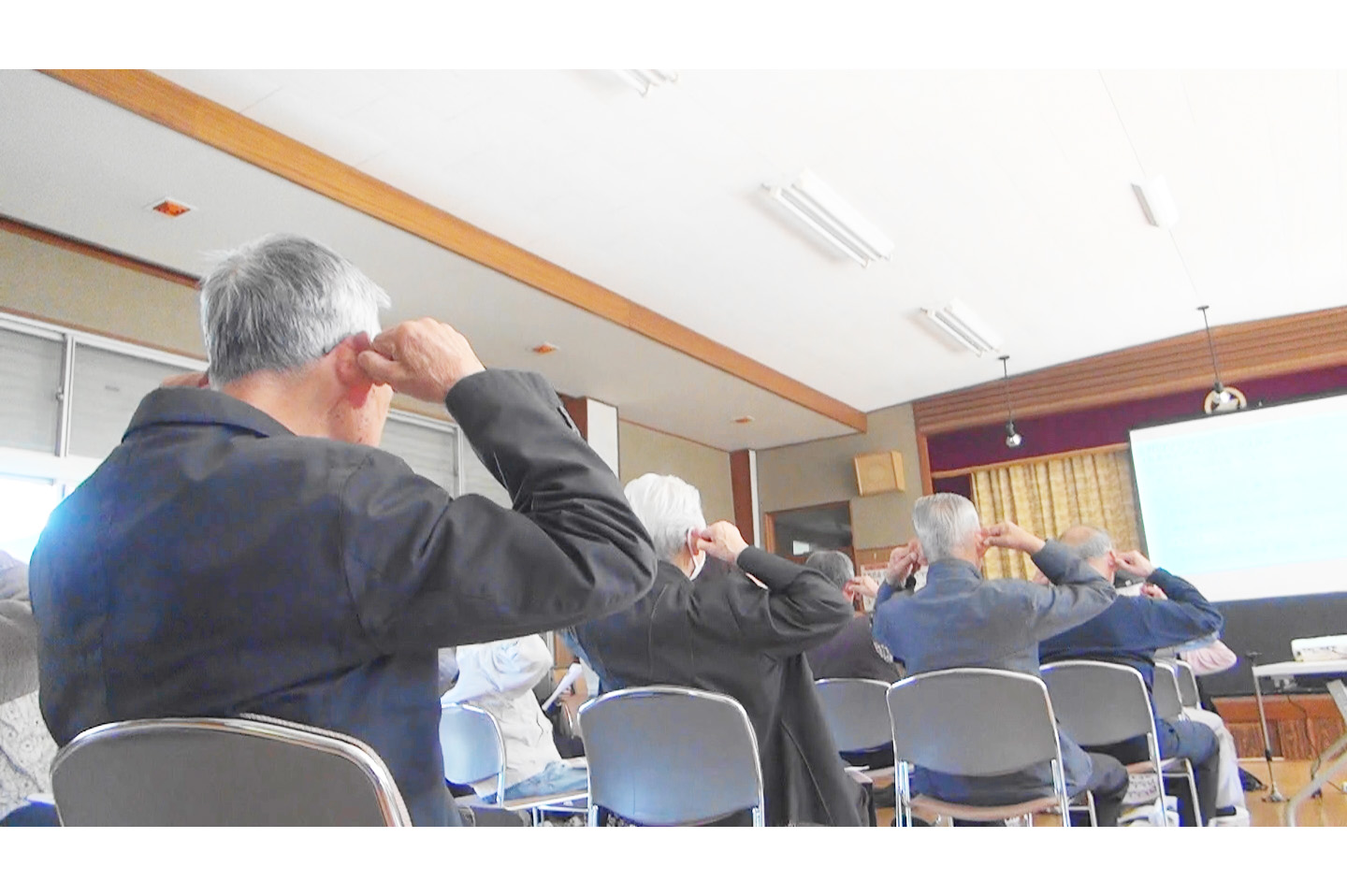 講演のあとは、いよいよ体操の時間。椅子に座ったままできる運動を中心に、首・肩・腕・足など全身をバランスよく動かしました。